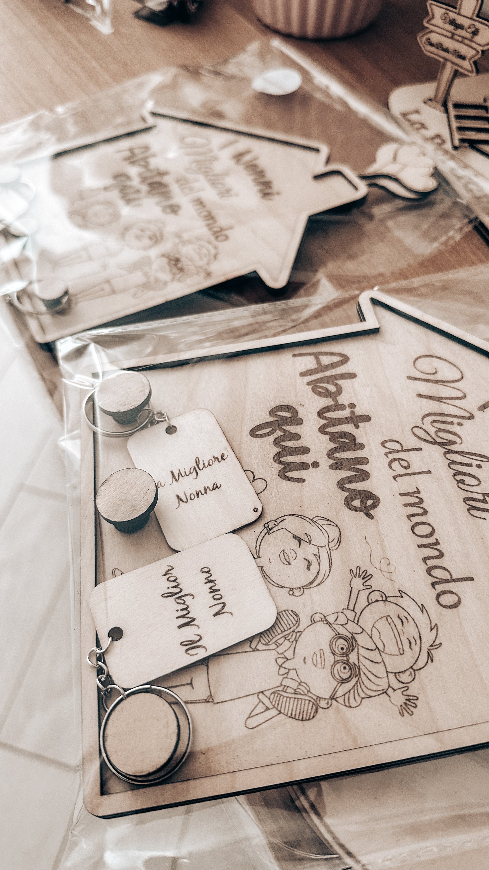 Il set include due portachiavi in legno con le incisioni “La Migliore Nonna” e “Il Miglior Nonno”, ideali per rendere ogni dettaglio ancora più speciale.