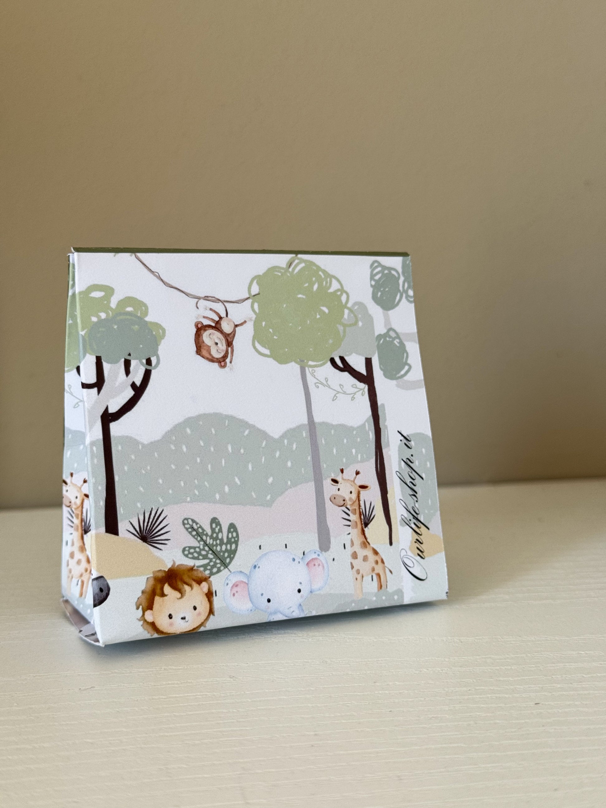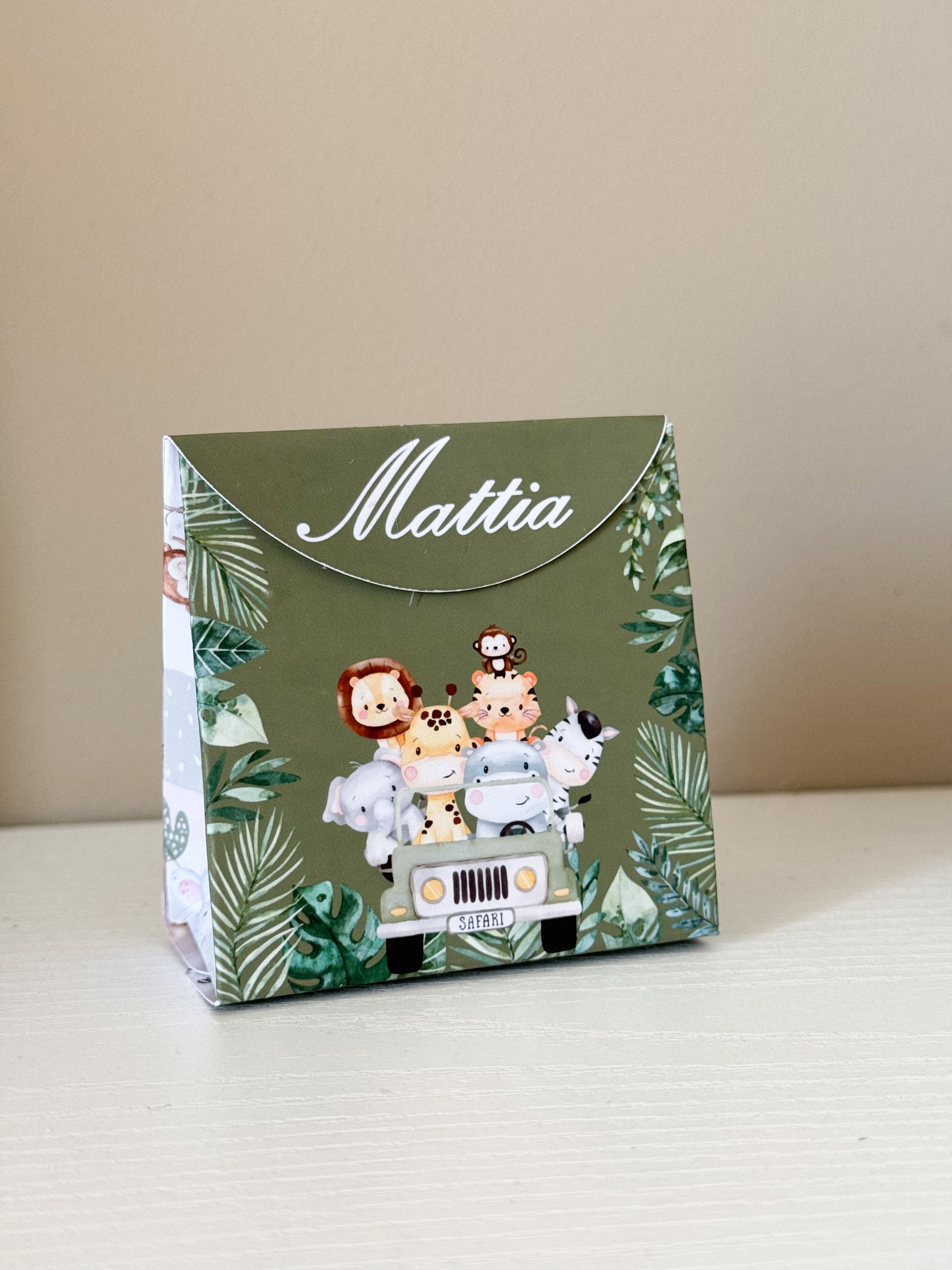 Scatolina porta confetti decorata con teneri animaletti (leone, zebra, giraffa, elefante e koala) e dettagli di foglie verdi. Un design elegante e moderno per celebrare al meglio i tuoi momenti speciali.