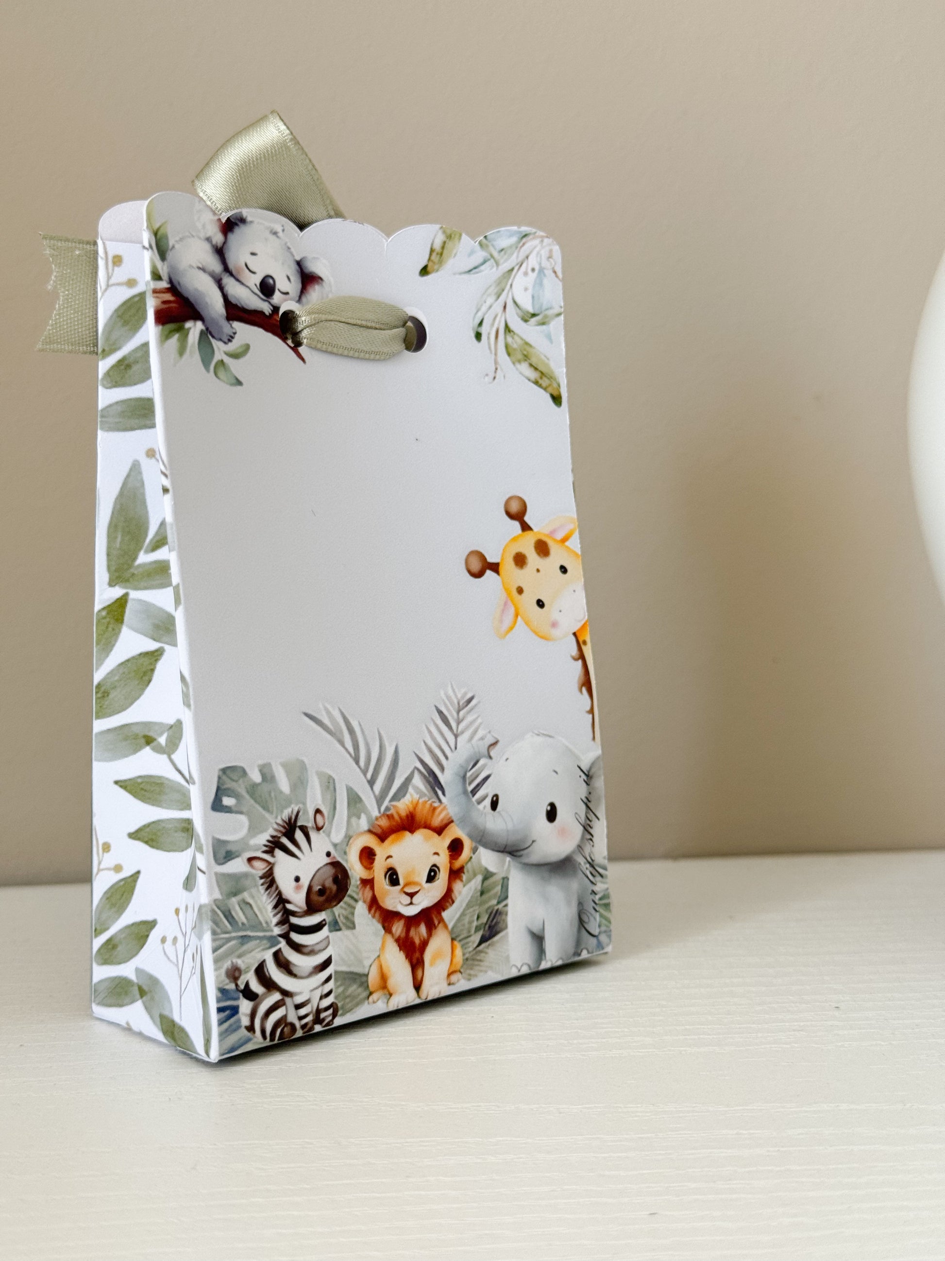 Scatolina porta confetti con sfondo verde safari e dolci animaletti che viaggiano su una jeep. Personalizzata con il nome del bambino, è l’idea perfetta per rendere unico ogni battesimo o baby shower.